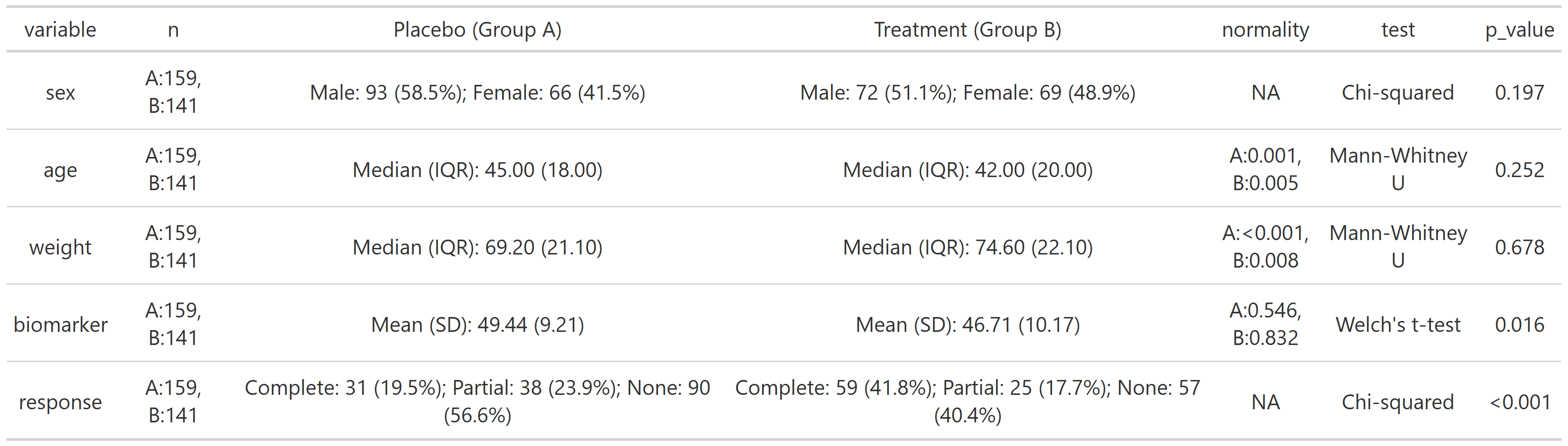 summary_table(clinical_df, group_by = 'treatment', exclude = c('subject_id', 'visit'))