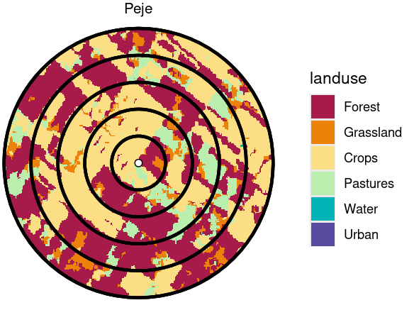 remotes::install_github("phuais/multilandr")A common landscape-scale study comprises the evaluation of a variable or process (e.g. species richness or any ecological response) along a set of landscapes varying in one or more attributes (e.g. the amount of natural habitat). Usually, this evaluation is made through the definition of several spatial-scales. Multi-scale landscapes can be defined as concentric circular buffers around a central point (each of the evaluated sites). There are plenty of examples for this experimental design in the literature, such as De Camargo et al. (2018), Melo et al., (2017) or Verga et al. (2021).